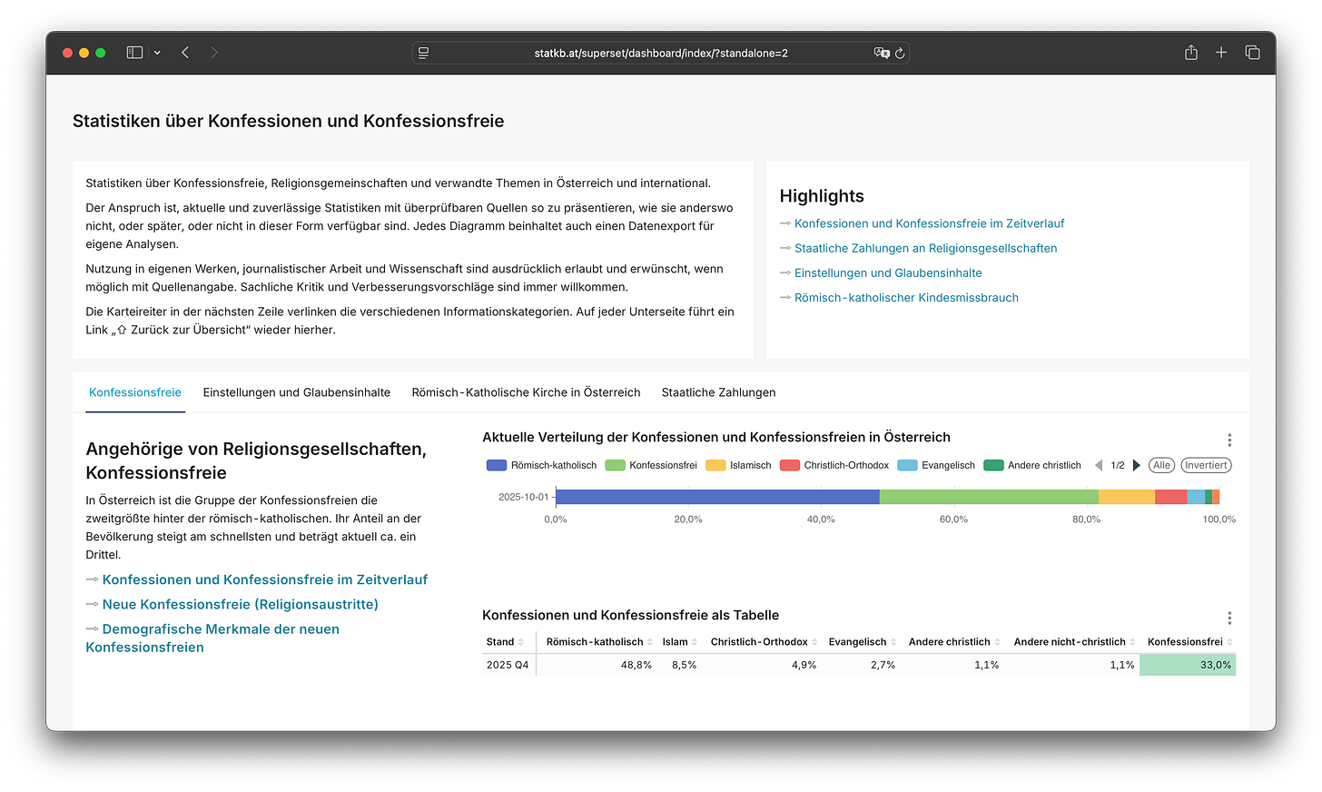 Es geht aber auch anders. Balázs Bárány (Präsident des HVÖ und im Vorstand der Konfessionsfreien) versteht jedenfalls sein statistisches Handwerk und ist – und das kann ich bestätigen – sorgsam im Umgang mit Daten. Balázs hat mit StatKB (Stastistiken mit Konfessionsfreien- und Konfessionsbezug) ein neues Service etabliert, das die österreichische Bevölkerung in ihrer weltanschaulichen Zusammensetzung erfasst. Damit können wir arbeiten.