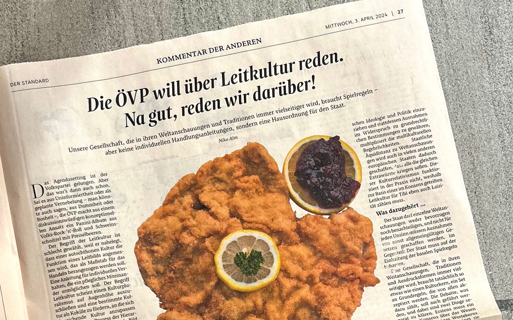 Zugegebenermaßen ist der Begriff der Leitkultur auch wirklich schlecht gewählt, weil er nahelegt, dass einer autochthonen Kultur die Funktion eines Leitbilds angemessen wird, das als Maßstab für das Handeln herangezogen werden soll. Eine An-leit-ung für individuelles Verhalten, die ein pflegliches Miteinander ermöglichen soll. Der Begriff Leitkultur scheint einen Kulturpluralismus auf Augenhöhe auszuschließen und eine bestimmte Kultur als Kokille zu fördern, an die sich abweichende Kultur anzupassen hat. Dass dieser Prozess der Hierarchisierung das vorherrschende Bild sein dürfte, legen auch jene nahe, die sich über den Vorstoß der ÖVP (durchaus trefflich) lustig machen, aber gleichzeitig versuchen, den Gedanken einer Leitkultur über das bloße Vorhandensein anderer Kulturen auszubremsen, in dem sie brav auswendig aufsagen, was nicht alles schon Teil unserer Kultur ist: vom Donut bis zum Döner, von Halloween bis Ramadan.