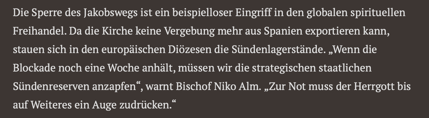 PS: Die Tagespresse hat mich in “Konflikt mit Papst eskaliert: Trump schließt Jakobsweg” unlängst leider auch falsch zitiert. Tatsächlich habe ja ich folgendes gesagt: